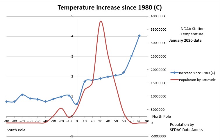 The graph below is NOAA data station temperature change by latitude with March 2019 data and before.